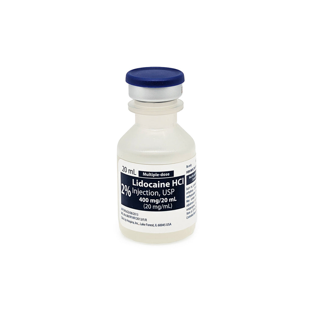 Lidocaine hydrochloride injection USP 2% (20mg/mL) — a sterile, preservative-free amide local anesthetic for infiltration and nerve block, including caudal and epidural use. Hospira, 20mL single-dose vial.