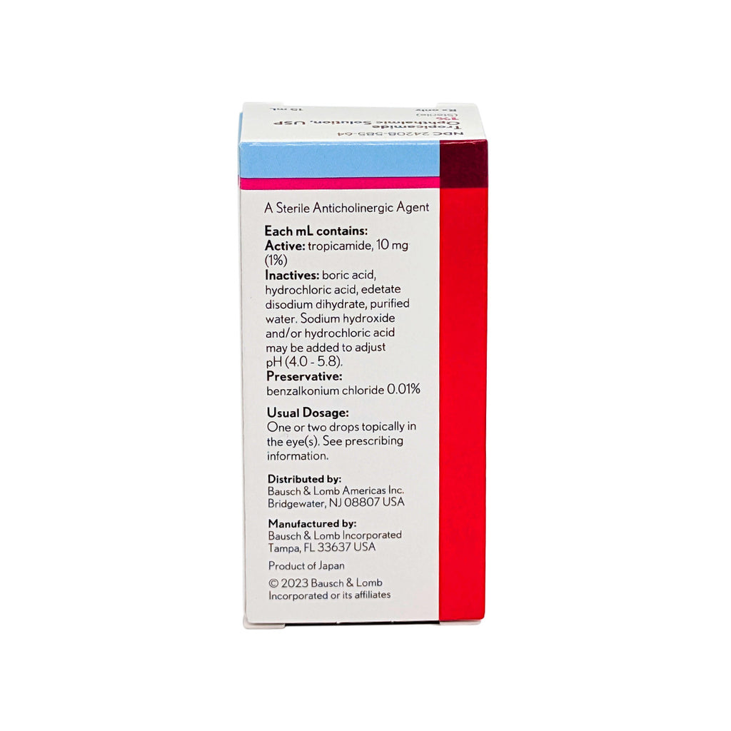 Tropicamide is an antimuscarinic that causes short-acting mydriasis (pupil dilation) and cycloplegia to aid examination of the lens, vitreous humor, and retina. Its effects typically last 4–8 hours, so it’s commonly used for dilated eye exams and may also be used before or after eye surgery.